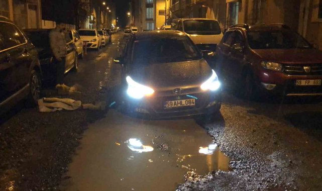 Tekirdağ'da yol çöktü, otomobil çukura saplandı