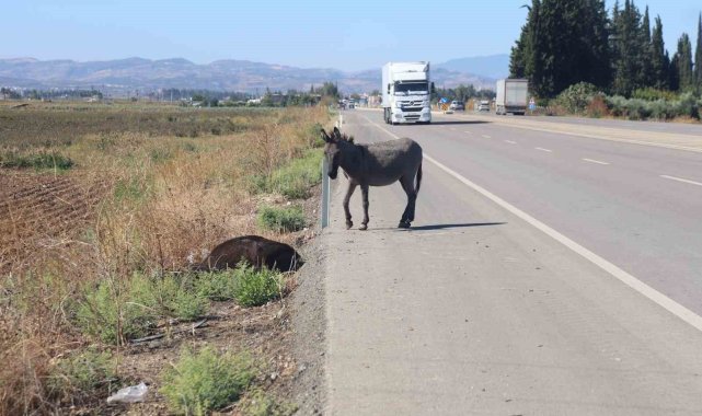 Hatay'da yolun karşısına geçmek isteyen eşek, aracın çarpmasıyla telef oldu. Telef olmasının ardından yol kenarına bırakılan eşeğin başında saatlerce bekleyen sıpası ise çevreden geçen vatandaşları duygulandırdı.
