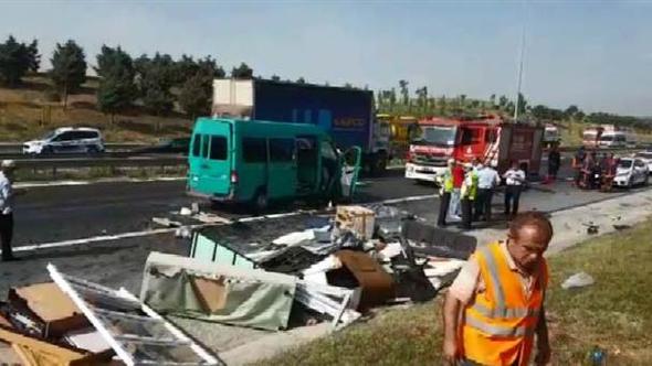 TEM Otoyolu İstanbul Kumburgaz mevkiinde TIR|a arkadan çarpan minibüsteki 2 kişi öldü. Kaza sonrası bölgede trafik tek şeride düşürüldü.