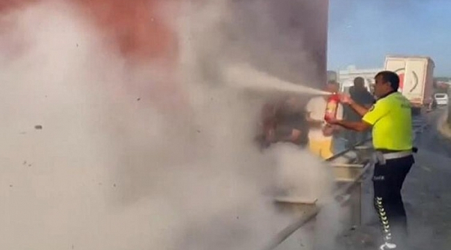 Durumu fark eden sürücü Karabacak, aracı emniyet şeridine çekerek dorseyi kupadan ayırdı. Dorsenin yandığını gören çevredeki diğer sürücüler, alevleri söndürmek için seferber oldu.
