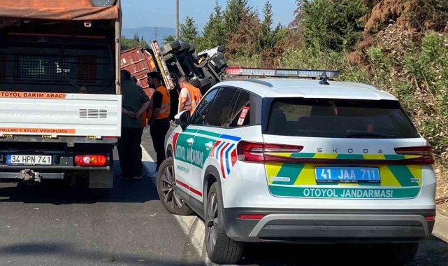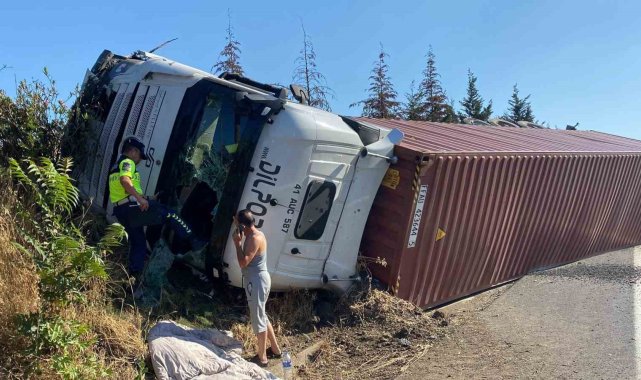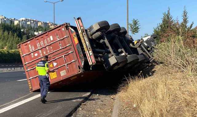 Kocaeli'nin İzmit ilçesi TEM otoyolu geçişinde konteyner yüklü tır devrildi. Sürücü kazayı hafif sıyrıklarla atlattı.