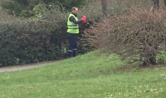 DÜZCE (İHA) – Düzce'de park ve bahçelerde çalışan bir temizlik işçisi, rüzgarda uçarak çalılıklara takılan Türk bayrağını bulunduğu yerden özenle alarak göğsünde muhafaza etti.
