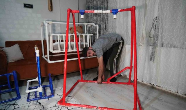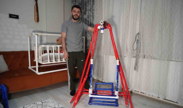 Tesisatçı baba adayından, doğacak bebeğine su borusundan beşik ve salıncak