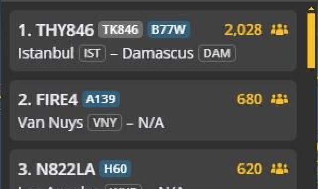Türk Hava Yolları'nın (THY) 13 yıl aradan sonra Suriye'nin başkenti Şam'a ilk seferi radarda en çok takip edilen uçuş oldu.Suriye'deki iç karışıklık nedeniyle 1 Nisan 2012'de ülkeye seferlerini durduran THY, bugün icra edilen İstanbul-Şam uçuşuyla Suriye operasyonlarını yeniden başlattı. Toplam 349 yolcu Şam Uluslararası Havalimanı'na gitmek için bilet ve pasaport kontrollerinin ardından uçağa alındı. Saat 09.00'da İstanbul Havalimanı'ndan kalkan TK 846 sefer sayılı Boeing 777 tipi yolcu uçağı, anlık olarak dünya genelinde en çok takip edilen uçuş oldu. FlightRadar24 uygulaması verilerine göre uçak, anlık olarak 3 binden fazla kişi tarafından takip edildi.