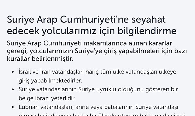 Suriye'de savaşın bitmesinin ardından Şam'a ilk seferini yapacak olan Türk Hava Yolları (THY), Suriye Arap Cumhuriyeti makamlarınca alınan karar doğrultusunda İsrail ve İran vatandaşlarının ülkeye taşımayacağını açıkladı.23 Ocak Perşembe günü Şam'a ilk seferini düzenleyecek olan Türk Hava Yolları (THY) resmi internet sitesinden yolcularına özel seyahat bilgilendirmesi yayımladı. Buna göre Suriye'ye seyahat edecek olan yolcular için Suriye Arap Cumhuriyeti Makamlarınca bir dizi kararlar alındı. Karara göre, İsrail ve Iran vatandaşları hariç tüm ülke vatandaşları ülkeye giriş yapabilecekler. Suriye vatandaşlarının Suriye uyruklu olduğunu gösteren bir belge ibrazı olacak. Lübnan vatandaşları ise anne veya babalarının Suriye vatandaşı olması halinde veya başka bir ülkede oturum hakkı ya da vizesi olması halinde ülkeye giriş yapabilecek. Basın mensupları özel izne tabi tutulacak.