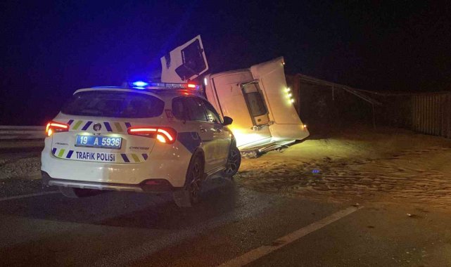 Çorum'da yem yüklü tırın devrilmesi neticesinde meydana gelen kazada sürücü yaralandı. Yola saçılan hayvan yemi sebebiyle kapanan yolda yaklaşık 2 kilometre uzunluğunda araç kuyruğu oluştu.