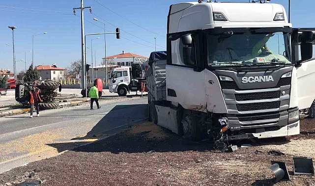 Konya'nın Ereğli ilçesinde mısır yüklü tırın çarpması sonucu traktör ikiye bölündü. Kazada her iki aracın sürücüsü yaralandı.