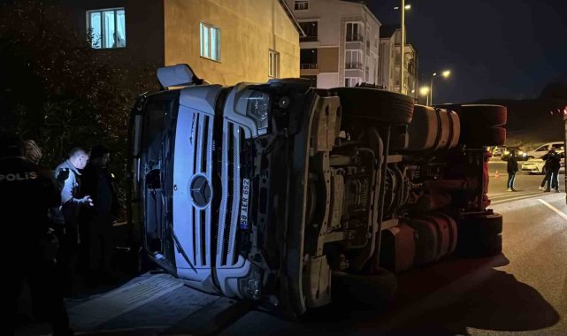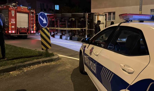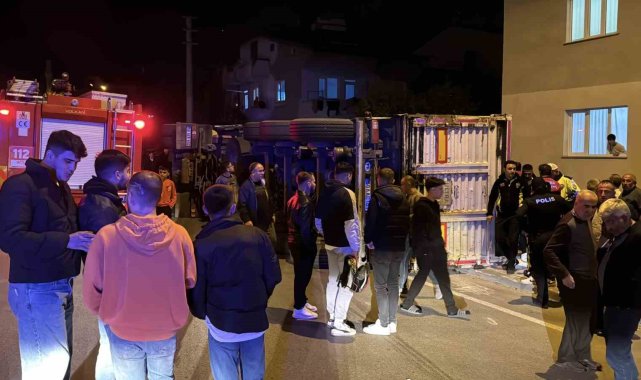 Tırın devrildiği anlar güvenlik kamerasına yansıdı