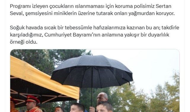 DÜZCE(İHA) – Düzce'de Cumhuriyet Bayramı çelenk sunma töreni sırasında yağan yağmurda vali koruması Polis Memuru Sertan Seval şemsiyesini törene katılan miniklerin üzerine tutarak yağmurdan korudu. Vali Aslan fotoğrafı sosyal medya hesabında paylaşarak şu notu düştü; "Türk polisi vicdan, merhamet ve adalet sahibidir."Tüm Yurtta olduğu gibi Düzce'de 29 Ekim Cumhuriyet Bayramı çeşitli etkinliklerle kutlanıyor. Kutlamalar sırasında objektiflere yansıyan bir fotoğrafı Düzce Valisi Selçuk Aslan sosyal medya hesabında paylaştı. Aslan, "Türk polisi vicdan, merhamet ve adalet sahibidir. 29 Ekim Cumhuriyet Bayramı çelenk törenimizde yağmur vardı; yağmura rağmen coşku ve gururun hakim olduğu törende, içimizi ısıtan bir detay objektiflerine yansımış. Programı izleyen çocukların ıslanmaması için koruma polisimiz Sertan Seval, şemsiyesini miniklerin üzerine tutarak onları yağmurdan koruyor. Soğuk havada sıcak bir tebessümle hafızalarımıza kazınan bu an; takdirle karşıladığımız, Cumhuriyet Bayramı'nın anlamına yakışır bir duyarlılık örneği oldu" ifadelerinde bulundu.