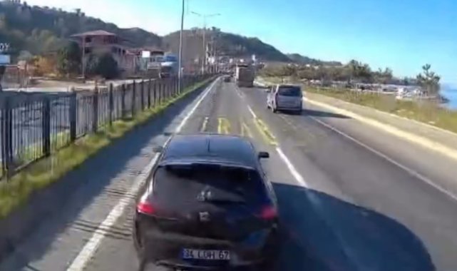 Trabzon'un Araklı ilçesinde kazaya davetiye çıkartan Araklı-Bayburt yolu ile Karadeniz sahil yolundaki sürücünün tehlikeli sürüş anları araç kameralarına yansıdı.