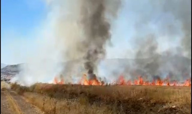 Traktörün kepçesinin elektrik tellerine temas etmesi ile çıkan yangında 50 dönüm arazi yandı