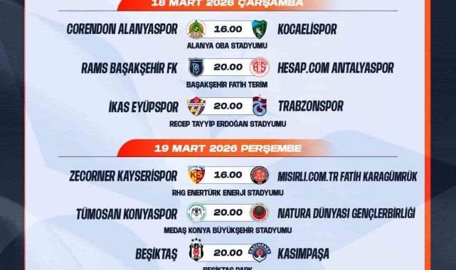 Trendyol Süper Lig'de 26-27. hafta müsabakalarına ilişkin program açıklandı.Türkiye Futbol Federasyonu (TFF), Süper Lig'de 26-27. hafta maçlarına ilişkin programı duyurdu. Galatasaray ve Samsunspor'un UEFA Şampiyonlar Ligi ve UEFA Konferans Ligi'nde son 16 turuna yükselmiş olmalarından dolayı, Göztepe - Galatasaray ile Çaykur Rizespor - Samsunspor mücadeleleri ileri bir tarihe ertelendi. Karşılaşmaların oynanacağı tarihler daha sonra ilan edilecektir.Süper Lig'de 26-27. hafta programları şöyle:26. hafta13 Mart Cuma20.00 Antalyaspor - Gaziantep FK20.00 Fatih Karagümrük - Fenerbahçe14 Mart Cumartesi13.30 Kocaelispor - Konyaspor16.00 Trabzonspor - Çaykur Rizespor20.00 Göztepe - Corendon Alanyaspor20.00 Galatasaray - Rams Başakşehir15 Mart Pazar16.00 Kasımpaşa - Eyüpspor20.00 Samsunspor - Kayserispor20.00 Gençlerbirliği - Beşiktaş27. hafta17 Mart Salı20.00 Fenerbahçe - Gaziantep FK18 Mart Çarşamba16.00 Corendon Alanyaspor - Kocaelispor20.00 Rams Başakşehir - Antalyaspor20.00 Eyüpspor - Trabzonspor19 Mart Perşembe16.00 Kayserispor - Fatih Karagümrük20.00 Konyaspor - Gençlerbirliği20.00 Beşiktaş - Kasımpaşa