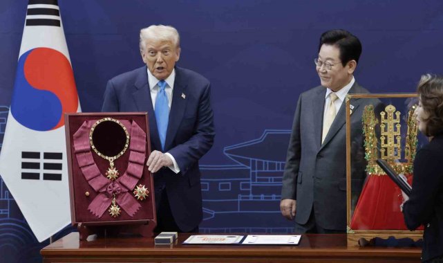 ABD Başkanı Donald Trump, Asya turunun 3'üncü ayağı olan Güney Kore'ye geldi. Güney Kore'nin en yüksek devlet onuru olan "Mugunghwa Büyük Nişanı" takdim edilen Trump'a, aynı zamanda ülke tarihinde önemli bir yeri bulunan Cheonmachong altın tacının bir replikası verildi.Japonya'daki diplomatik temaslarını tamamlayan ABD Başkanı Donald Trump, Asya turunun 3'üncü durağı olan Güney Kore'ye geldi. Trump'ı taşıyan uçak yerel saatle 11.30 sıralarında Busan'daki Gimhae Uluslararası Havalimanı'na iniş yaptı. Güney Kore Dışişleri Bakanı Cho Hyun ve ABD Büyükelçisi Kang Kyung-hwa tarafından askeri törenle karşılanan Trump için bir devlet başkanına gösterilen en yüksek nezaket seviyesi olan 21 pare top atışı yapıldı. Marine One helikopteri ile buradan ayrılan Trump, daha sonra Gyeongju şehrinde Güney Kore Devlet Başkanı Lee Jae Myung tarafından karşılandı. Gyeongju Ulusal Müzesi'nde ziyaretçi defterini imzalayan Trump'a, Güney Kore'nin en yüksek devlet onuru olan "Mugunghwa Büyük Nişanı" takdim edildi. Trump'a ayrıca ülke tarihinde önemli bir yeri bulunan Cheonmachong altın tacının bir replikası verildi. Trump ve Lee, törenin ardından gerçekleştirecekleri ikili görüşmeye geçti.
