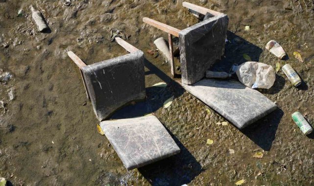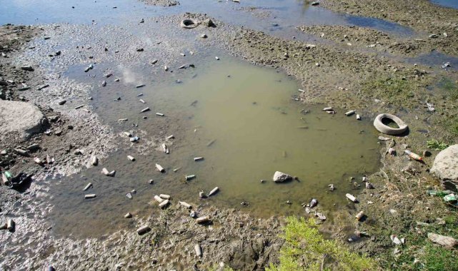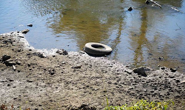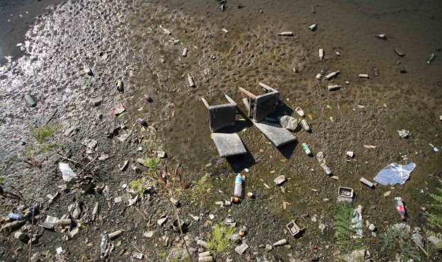 Edirne'de Tunca Nehri'nde yaşanan kuraklıkla birlikte onlarca araç lastiği, içki şişesi ve sandalyeler gibi atıklar su yüzeyine çıktı.