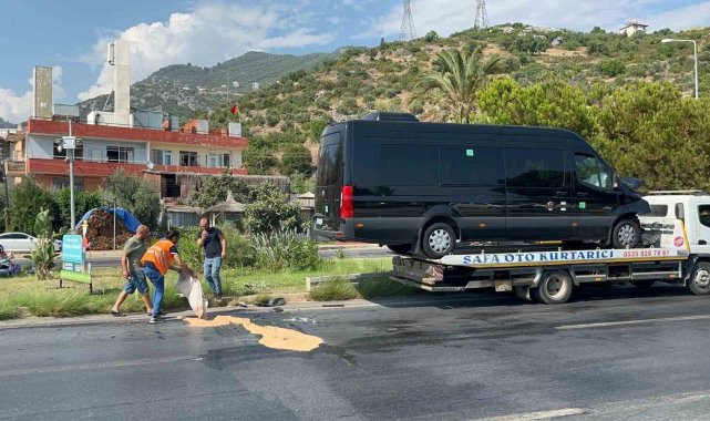Antalya'nın Alanya ilçesinde tur minibüsü ile hafif ticari aracın çarpışması sonucu meydana gelen kazada 2 kişi yaralandı.Kaza, saat 15.30 sıralarında Alanya'nın Dinek Mahallesi D-400 karayolu üzerindeki Dinek Kavşağı'nda meydana geldi. Edinilen bilgilere göre, Ş.A.'nın (47) kullandığı 07 CCD 198 plakalı Mercedes marka tur minibüsü ile M.S.'nin kullandığı 07 BVD 215 plakalı Volkswagen marka hafif ticari araç çarpıştı. Çevredeki vatandaşların ihbarı üzerine olay yerine 112 Acil Çağrı Merkezi ekipleri yönlendirildi. Kazada minibüs şoförü ile hafif ticari araçta yolcu olarak bulanan bir kişi yaralandı. Ambulans ekiplerinin olay yerindeki ilk müdahalesinin ardından yaralılar ambulans ile Alanya Eğitim ve Araştırma Hastanesine kaldırıldı. Öte yandan hafif ticari araç sürücüsü M.S. ise kazayı yara almadan atlattı. Kazayla ilgili inceleme başlatıldı.