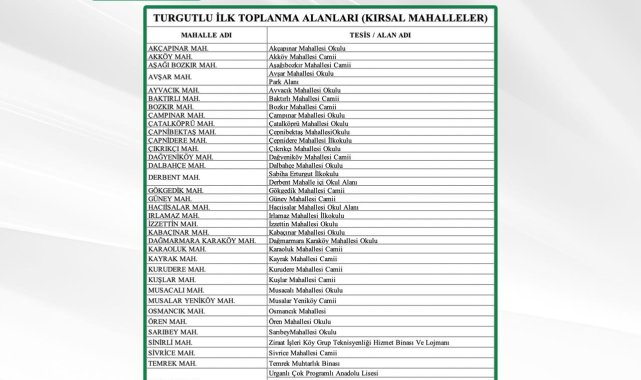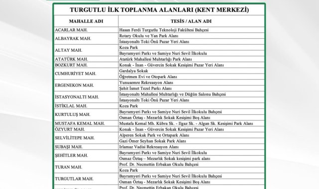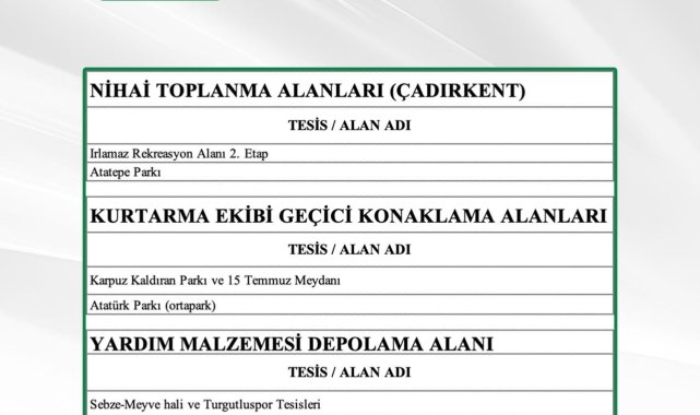 Turgutlu Belediyesi, 6 Şubat Kahramanmaraş merkezli depremlerinin yıl dönümü yaklaşırken, vatandaşlara deprem gerçeğini unutmamaları ve olabilecek afetlere karşı hazırlıklı olmaları konusunda uyarıda bulundu. Bu kapsamda, Turgutlu'da olabilecek bir deprem durumunda kullanılabilecek güvenli toplanma alanlarının bilgisi paylaşıldı.Turgutlu Belediyesi, asrın felaketi olarak adlandırılan Kahramanmaraş merkezli 6 Şubat depreminin yıl dönümü yaklaşırken, Turgutlulu vatandaşlara deprem gerçeğini unutmamaları ve afetlere karşı hazırlıklı olmaları yönünde çağrıda bulundu. Yapılan açıklamada, olabilecek bir depreme karşı bilinçli ve tedbirli olmanın hayati önem taşıdığı vurgulandı. Belediye yetkilileri, deprem anında panik yaşanmaması ve güvenli tahliye sağlanabilmesi için ilçede belirlenen toplanma alanlarının vatandaşlar tarafından önceden bilinmesi gerektiğini belirtti.Turgutlu Belediyesi tarafından yapılan uyarıda, "Kahramanmaraş merkezli 6 Şubat depremlerinin yıl dönümü yaklaşırken, ülkemizin deprem gerçeğini unutmamamız gerektiğini bir kez daha hatırlatmak istiyoruz. Afetlere karşı bilinçli ve hazırlıklı olmak hepimiz için hayati önem taşıyor. Bu doğrultuda, Turgutlu'muzda olabilecek bir deprem anında toplanabileceğiniz güvenli alanların bilgisi ilgili görsellerde yer alıyor. Acil durumlarda hızlı ve güvenli hareket edebilmek için bu alanları önceden incelemenizi, deprem çantanızı kişisel ihtiyaçlarınıza göre hazırlamanızı ve hayat üçgeni ilkesini hatırlayarak gerekli tedbirleri almanızı tavsiye ediyoruz. Tedbirli olmak hayat kurtarır" denildi.