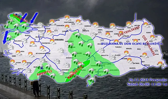 Meteoroloji, Marmara Bölgesi ve Kuzey Ege kıyılarında kuzeydoğu yönlerden yer yer kuvvetli (40-70 km/sa) esmesi beklenen fırtına dolayısıyla ulaşımda aksamalar ve çatı uçması gibi olumsuzluklara karşı vatandaşları uyardı. Antalya çevreleri, Doğu Akdeniz'in batısı ile Kırklareli çevrelerinde kuvvetli yağmur ve sağanak, zamanla Kırklareli'nin yüksekleri ile Akdeniz'in yükseklerinde ise karlakarışık yağmur ve kar yağışı bekleniyor.ANKARA (İGFA) - Meteoroloji Genel Müdürlüğü, 26 Aralık Perşembe gününe ilişkin hava tahmin raporunu yayımladı.Son tahminlere göre Türkiye genelinin çok bulutlu, Marmara, Akdeniz, İç Anadolu'nun doğusu, Batı ve Orta Karadeniz(Ordu hariç), Doğu Anadolu'nun güney ve batısı ile Muğla, Karaman, Gümüşhane, Bayburt ve Erzurum çevrelerinin yağışlı geçeceği tahmin ediliyor.Doğu Akdeniz'in batısı ile Antalya ve Kırklareli çevrelerinde kuvvetli olması beklenen yağışların, genellikle yağmur ve sağanak, Akdeniz kıyılarında yer yer gök gürültülü sağanak, Trakya, Batı Akdeniz'in yüksekleri, Doğu Akdeniz'in Toroslar kesimi, Doğu Karadeniz'in iç kesimleri ve Doğu Anadolu'nun yüksek kesimlerinde karla karışık yağmur ve yer yer kar şeklinde olması bekleniyor.Türkiye'nin doğu kesimlerinde buzlanma ve don olayı, Doğu Karadeniz'in iç kesimlerinin yüksekleri ile Doğu Anadolu'nun doğusunun dik ve eğimli yamaçlarında çığ tehlikesi konusunda vatandaşların tedbirli olunması istenirken, 'kuvvetli' bir uyarı da Antalya ve Doğu Akdeniz'in batısı ile Kırklareli çevreleri için geldi. Kuvvetli yağmur ve sağanak, zamanla Kırklareli'nin yüksekleri ile Akdeniz'in yükseklerinde karlakarışık yağmur ve kar yağışı konusunda vatandaşların tedbirli olunması istendi.