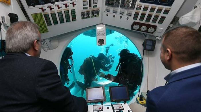 Dalış sırasında denizaltının reklamlarında kullanılması planlanan fotoğraf ve videoları sualtı fotoğrafçısı Tahsin Ceylan ve ekibi çekti. Çekim sonrası Ceylan|ın yardımcıları, üzerinde |Türk turizminin geleceği için El Ele| yazılı pankart açtı. Pankart açan balıkadamları denizcilerin su altı iletişiminde kullandığı |ok| anlamına gelen el işareti ile selamlayan Vali Münir Karaloğlu aynı zamanda |Rabia| işareti yaparak da selam verdi.
