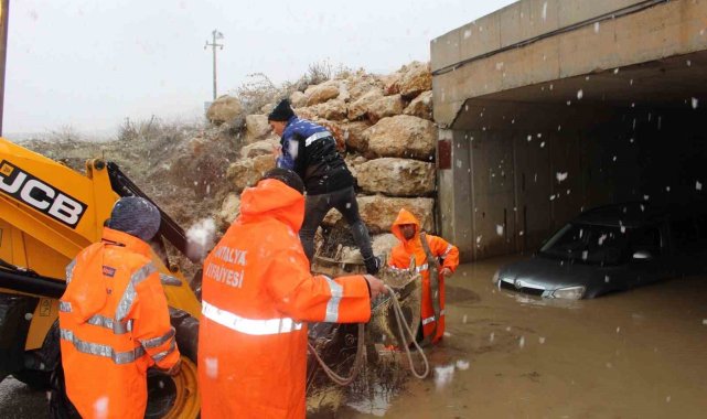 Meteorolojik uyarı sonrası 833 personel, 487 araç ve iş makinesi, 199 motopomp ile teyakkuza geçen Antalya Büyükşehir Belediyesi, 19 ilçede olumsuzlara anında müdahale ediyor.Antalya Büyükşehir Belediyesi, kent genelinde yaşanan kuvvetli fırtına, şiddetli yağmur ve kar yağışının beraberinde getirdiği olumsuzluklara kısa sürede müdahale etti. İtfaiye ve ASAT başta olmak üzere 833 personel, 487 araç ve iş makinesi, 199 motopomp ile yaşanabilecek olumsuzluklara karşı hazır bekleyen Büyükşehir Belediyesi, tüm birimleriyle vatandaşın yardımına koştu. Park ve Bahçeler ekipleri, fırtınanın yan yatırdığı ağaç ve kırılan dalları kısa sürede kaldırdı. ASAT ekipleri, gün boyu yağmur suyunun getirdiği yaprak ve atıklarla tıkanan mazgalları açmak için yoğun bir çalışma sergiledi.İtfaiye 206 vakaya müdahale ettiAntalya Büyükşehir Belediyesi İtfaiye Daire Başkanlığı, 19 ilçede 164 su baskını, 2 istinat duvarı çökmesi, 15 ağaç devrilmesi, 15 mahsur kalma, 1 elektrik direği devrilme tehlikesi, 3 toprak kayması, 1 prefabrik bina uçması, 1 yıldırım düşmesi, 2 tabela düşme, 2 çatı uçması olayı olmak üzere toplam 206 vakaya müdahale etti.Mahsur kalanlar kurtarıldıAntalya Büyükşehir Belediyesi Korkuteli ASAT ve itfaiye ekipleri, Kargalık Mahallesi köprüsü alt geçidinde sağanak yağıştan dolayı araçlarında mahsur kalan vatandaşları kurtardı. Akseki Kuyucak Mahallesi Salarkoyun mevkisinde geçimini hayvancılıkla sağlayan vatandaşların şiddetli yağış sonrası obalarında mahsur kalması üzerine harekete geçen Büyükşehir ekipleri, yolu açarak vatandaşları ve hayvanların tahliyesini sağladı.Korkuteli'de kar temizliğiKırsal Hizmetler Daire Başkanlığı ekipleri, yoğun kar yağışının kapattığı Korkuteli ilçesi Taşkesiği, Karabayır, Ovacık mahalleleri yolunda kar küreme ve tuzlama çalışması yaptı. Ekiplerin, yoğun çalışmasıyla mahalle yolu ulaşıma açıldı. Kırsal Hizmetler ekipleri, Manavgat'ta şiddetli yağışlardan dolayı toprak kayması meydana gelen grup yollarında da temizlik yaparak, ulaşımı güvenli hale getirdi. Alanya'nın Bademağacı Mahallesi'nde de selin zarar verdiği yolda bakım onarım çalışması yapıldı. İbradı'da da yoğun yağış nedeniyle düşük kotta bulunan bazı binaların zemin katlarını su bastı. Büyükşehir Belediyesi İtfaiyesi suyu tahliye ederken, ASAT ekipleri de tıkanan yağmur suyu kanallarına müdahale etti.