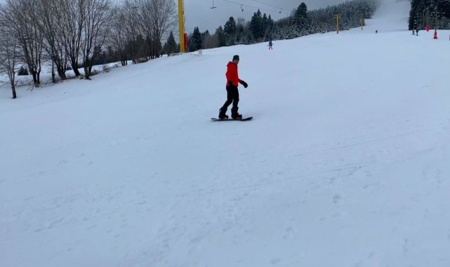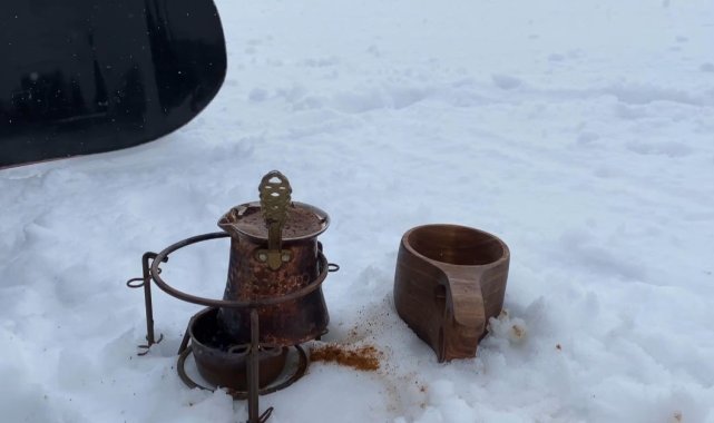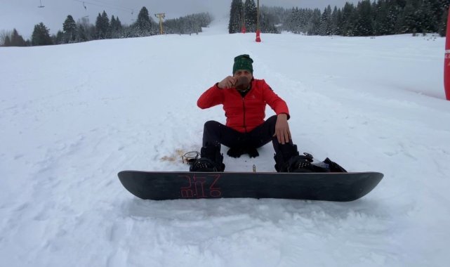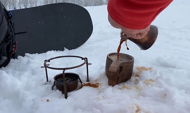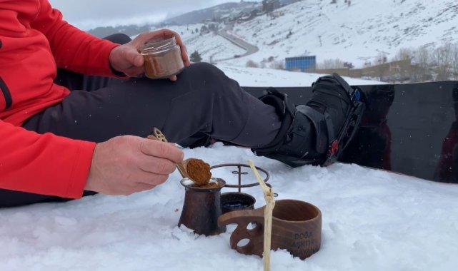 Uludağ'da snowboard yaparken Türk Kahvesi yudumladı