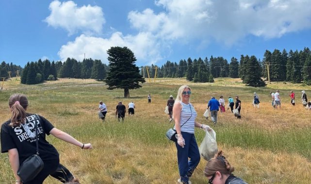 Uludağ'da yangın riskine karşı her taşın altını temizleyen kayak öğretmenleri ve aileleri, 30 poşet çöp ve 2 konteyner atık topladı.