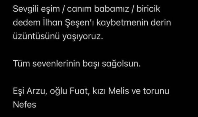 Uzun süredir kanser tedavisi gören usta sanatçı İlhan Şeşen hayatını kaybetti.Uzun süredir kanser tedavisi gören usta sanatçı İlhan Şeşen'den acı haber geldi. "Sarılınca Sana", ve "Ellerimde Çiçekler" gibi akıllarda yer edinen şarkılarla Türk pop müziğine damga vuran usta sanatçı 76 yaşındaki hayatını kaybetti. Kötü haberi ünlü sanatçının ailesi sosyal medya hesabından paylaştı. Paylaşımda, "Sevgili eşim / canım babamız / biricik dedem İlhan Şeşen'i kaybetmenin derin üzüntüsünü yaşıyoruz. Tüm sevenlerinin başı sağ olsun. Eşi Arzu, oğlu Fuat, kızı Melis ve torunu Nefes" ifadelerine yer verildi.