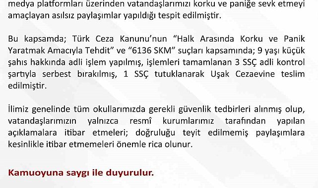 Uşak Valiliği tarafından yapılan açıklamaya göre, sosyal medya üzerinden okullara yönelik saldırı olabileceği yönünde yapılan asılsız paylaşımlara ilişkin yürütülen çalışmalarda yaşı küçük 9 kişi hakkında adli işlem yapıldı, 1'i tutuklandı.Uşak Valiliği sosyal medya üzerinden yapılan yazılı açıklamada, Şanlıurfa ve Kahramanmaraş illerinde okullara yönelik gerçekleştirilen saldırılara benzer olayların Uşak'ta da yaşanacağı yönünde sosyal medya platformları üzerinden vatandaşları korku ve paniğe sevk etmeyi amaçlayan asılsız paylaşımların tespit edildiği bildirildi. Söz konusu paylaşımlar üzerine başlatılan çalışmalar kapsamında yaşı küçük 9 kişi hakkında adli işlem yapıldığı belirtilerek, işlemleri tamamlanan 3'ünün adli kontrol şartıyla serbest bırakıldığı, 1'inin ise tutuklanarak cezaevine teslim edildiği kaydedildi.Yapılan açıklamada; "Bu kapsamda, Türk Ceza Kanunu'nun 'halk arasında korku ve panik yaratmak amacıyla tehdit' ve '6136 sayılı kanuna muhalefet' suçları kapsamında 9 yaşı küçük hakkında adli işlem yapılmış, işlemleri tamamlanan 3 çocuk adli kontrol şartıyla serbest bırakılmış, 1 SSÇ tutuklanarak Uşak Cezaevine teslim edilmiştir. İlimiz genelinde tüm okullarımızda gerekli güvenlik tedbirleri alınmış olup, vatandaşlarımızın yalnızca resmi kurumlarımız tarafından yapılan açıklamalara itibar etmeleri, doğruluğu teyit edilmemiş paylaşımlara kesinlikle itibar etmemeleri önemle rica olunur." ifadelerine yer verildi.