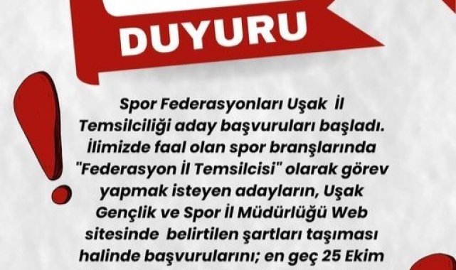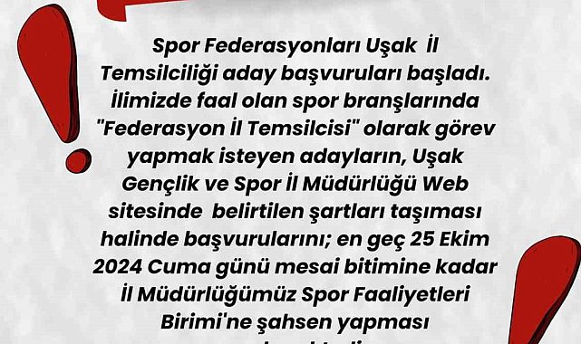 Uşak'ta Spor Federasyonları Uşak İl Temsilciliği aday başvuruları başladı.Uşak Gençlik ve Spor İl Müdürlüğü yapmış olduğu duyuruda Uşak'ta faal olan spor branşlarında Federasyon İl Temsilciliği başvurularının başladığını duyurdu. Gençlik ve Spor İl Müdürlüğü sosyal medya hesaplarından yapıla paylaşımda ise; "Spor Federasyonları Uşak İl Temsilciliği aday başvuruları başladı. İlimizde faal olan spor branşlarında "Federasyon İl Temsilcisi" olarak görev yapmak isteyen adayların, Uşak Gençlik ve Spor İl Müdürlüğü resmi sitesinde belirtilen şartları taşıması halinde başvurularını; en geç 25 Ekim 2024 Cuma günü mesai bitimine kadar Sportif Değerlendirme ve Takip Birimine başvuru evraklarını teslim etmesi gerekmektedir." ifadeleri kullanıldı.