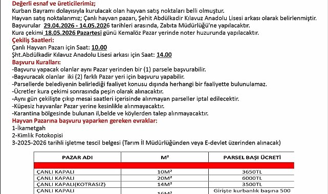 Uşak Belediyesi yaklaşan Kurban Bayramı öncesi vatandaşların kurbanlık hayvan alabileceği noktaları belirledi. Çanlı Hayvan Pazarı ve Şehit Abdülkadir Kılavuz Anadolu Lisesi arkası olmak üzere iki ayrı noktada kurulacak pazarlar için başvurular bugün başladı.Başvuru işlemleri 29 Nisan - 14 Mayıs 2026 tarihleri arasında Zabıta Müdürlüğü'ne yapılabilecek. Diğer yandan satış noktalarının belirlenmesi için Kemalöz Pazaryerinde 18 Mayıs 2026 tarihinde noter huzurunda kura çekimi gerçekleştirilecek. Çekilişler Çanlı Hayvan Pazarı için saat 10:00'da, Şehit Abdülkadir Kılavuz Anadolu Lisesi arkası için ise saat 14:00'da yapılacak.Başvuru kurallarına göre, esnaf ve üreticiler aynı pazar yerinden yalnızca bir parsel için başvurabilecek. Ancak her iki pazar yerine de başvuru yapma hakkına sahip olacaklar. Parsellerde belirlenen faaliyet konusu dışında herhangi bir çalışma yürütülemeyecek.Öte yandan kura çekiminin ardından ücretler peşin olarak tahsil edilecek. Çekilişte hak kazanıp mesai saatleri içerisinde alınmayan parseller ise doğrudan iptal edilecek. Küpesiz hayvanlar pazar yerine alınmayacak, karantina bölgelerinden ise başvuru kabul edilmeyecek.Hayvan pazarına başvuru yapmak isteyenlerin ikametgah ve kimlik fotokopisinin yanı sıra, Tarım İl Müdürlüğü'nden ya da E-devlet üzerinden alınacak 2025-2026 tarihli işletme tescil belgesini hazırlamaları gerekiyor. Tüm bu belgelerin eksiksiz olarak Zabıta Müdürlüğü'ne teslim edilmesi önem taşıyor.