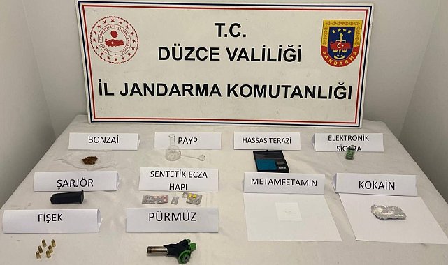 DÜZCE(İHA) – Düzce'de Jandarma ekipleri tarafından yapılan operasyonda bir evde yapılan aramada bir miktar uyuşturucu ele geçirildi. Olayda 1 kişi uyuşturucu madde ticareti yapmak suçundan tutuklandı.Düzce Cumhuriyet Başsavcılığı koordinesinde uyuşturucu ile mücadele sürüyor. Jandarma ekipleri tarafından Mergiç Mahallesinde ikamet eden M.K. (43) isimli şahsın ikametinde ve eklentilerinde gecikmesinde sakınca bulunan hal kapsamında arama yapıldı. Yapılan aramada 7 adet uyuşturucu hap, 3 gram met, 2 gram kokain, 6 gram bonzai, hassas terazi, likit esrar olduğu değerlendirilen elektronik sigara, 2 adet uyuşturucu kullanma aparatı, pürmüz, boş tabanca şarjörü ve 6 adet fişek ele geçirildi.Cumhuriyet Savcısının talimatı doğrultusunda gözaltına alınan M.K. çıkarıldığı adli makamlarca uyuşturucu madde ticareti suçundan tutuklandığı bildirildi.