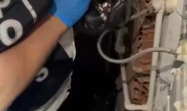 İzmir'in Buca ilçesinde bir adrese düzenlenen uyuşturucu operasyonunda tuvalette yapılan aramada polis ekipleri şaşkına döndü. Uyuşturucu tacirinin tuvalette klozetin olduğu bölümde kumandalı bir düzenekle kapı yaptığı, kapının arkasındaki sığınakta uyuşturucu maddeleri sakladığı, polis baskınında da burada gizlendiği ortaya çıktı. Şüphelinin sığınakta yakalanma anları ise polis kamerasıyla kaydedildi.İzmir Narkotik Suçlarla Mücadele Şube Müdürlüğü ekipleri, Buca ilçesinde C.A. adlı bir kişinin adresinde yüklü miktarda uyuşturucu saklandığı bilgisi üzerine harekete geçti. Savcılıktan alınan izinle adrese baskın gerçekleştiren ekipler, C.A.'ya ve uyuşturucu maddelere rastlamadı. Evin tuvaletinde yapılan aramada ise ekipler klozet bölümünün arkasındaki duvarın yapısında menteşelere rastladı. Duvarın arkasından sesler geldiğini fark eden polis, orada bir kişinin gizlendiğini tespit etti.Yakalanma anları kameradaPolisin iknasıyla kapıya dönüştürülen duvarın arkasından elleri yukarıda çıkartılan kişinin C.A. olduğu anlaşıldı. C.A., polis ekipleri tarafından yakalanırken, sığınağa dönüştürülen yerde poşetler içerisinde çok sayıda uyuşturucu nitelikli 3 bin 612 adet hap ele geçirildi. Öte yandan adreste yapılan aramada, 3 tüfek ve 17 tüfek fişeği ele geçirildi.2 yıl 8 ay kesinleşmiş hapis cezasıyla arandığı da belirlenen C.A., sorgulanmak üzere emniyete götürüldü.