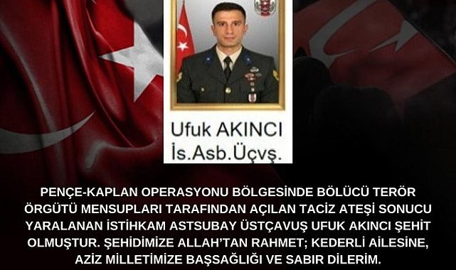 Eskişehir Valisi Hüseyin Aksoy, 23 Ocak'ta Pençe-Kaplan operasyonu bölgesinde şehit olan İs.Asb.Üçvş. Ufuk Akıncı için resmi sosyal medya hesabından taziye mesajı paylaştı.Milli Savunma Bakanlığı 23 Ocak'ta, Pençe-Kaplan operasyonu bölgesinde bölücü terör örgütü mensupları tarafından açılan taciz ateşi sonucu ağır yaralanan İs.Asb.Üçvş. Ufuk Akıncı'nın şehit olduğunu açıkladı. Akıncı'nın cenazesinin Şırnak'ta düzenlenecek askeri törenin ardından Ankara'ya getirileceği öğrenildi. Eskişehir Valisi Hüseyin Aksoy, şehit İs.Asb.Üçvş. Ufuk Akıncı için resmi sosyal medya hesabından taziyede bulundu. Vali Aksoy, paylaşımında şu ifadelere yer verdi:"Pençe-Kaplan Operasyonu bölgesinde bölücü terör örgütü mensupları tarafından açılan taciz ateşi sonucu yaralanan İstihkam Astsubay Üstçavuş Ufuk Akıncı şehit olmuştur. Şehidimize Allah'tan rahmet; kederli ailesine, aziz milletimize başsağlığı ve sabır dilerim."