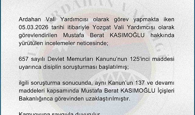 Ardahan Vali Yardımcısı Mustafa Berat Kasımoğlu, İçişleri Bakanlığınca görevinden uzaklaştırıldı.Ardahan Valiliği'nden yapılan yazılı açıklamada, ''Ardahan Vali Yardımcısı olarak görev yapmakta iken 05.03.2026 tarihi itibariyle Yozgat Vali Yardımcısı olarak görevlendirilen Mustafa Berat Kasımoğlu hakkında yürütülen incelemeler neticesinde; 657 sayılı Devlet Memurları Kanunu'nun 125'inci maddesi uyarınca disiplin soruşturması başlatılmış; ilgili soruşturma sonucunda, aynı Kanun'un 137 ve devamı maddeleri kapsamında Mustafa Berat Kasımoğlu İçişleri Bakanlığınca görevinden uzaklaştırılmıştır'' ifadelerine yer verildi.