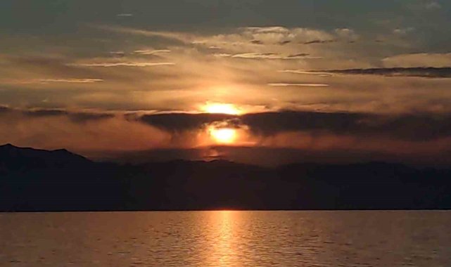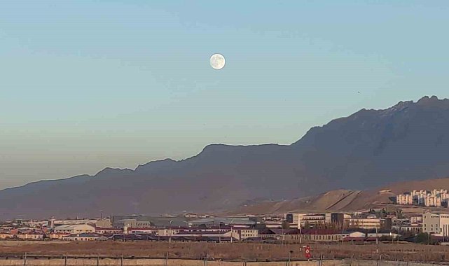 Van'da akşam saatlerinde güneş batarken, doğu ufkunda ayın yükselmesi gökyüzünde etkileyici bir manzara oluşturdu. Gün batımıyla birlikte ayın parlak yüzü aynı anda gökyüzünü süsledi.