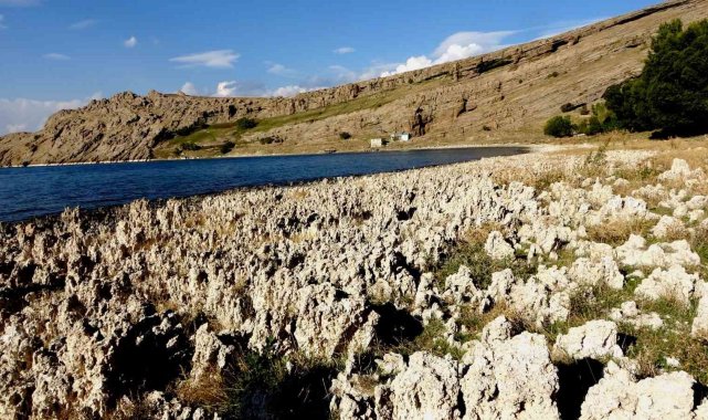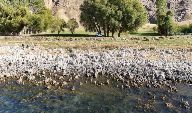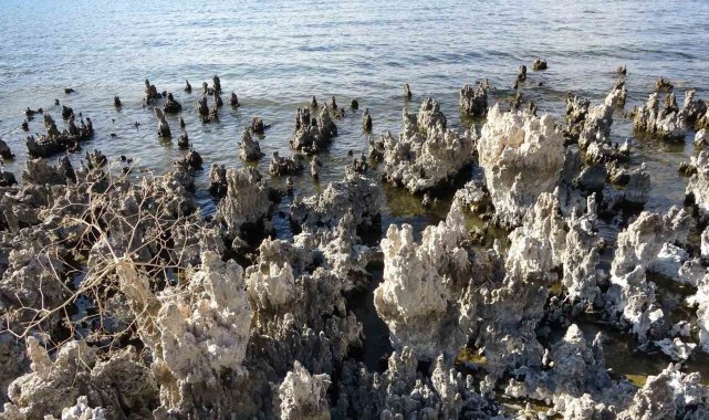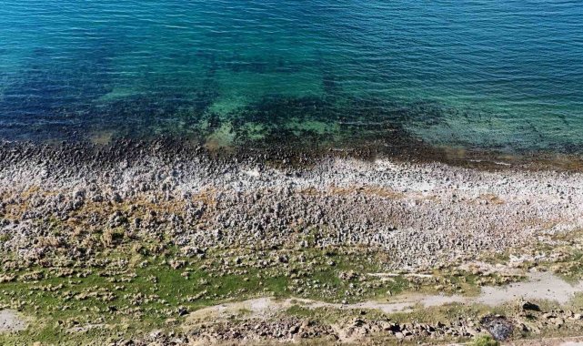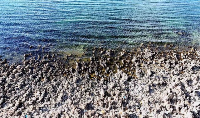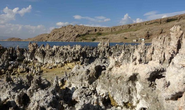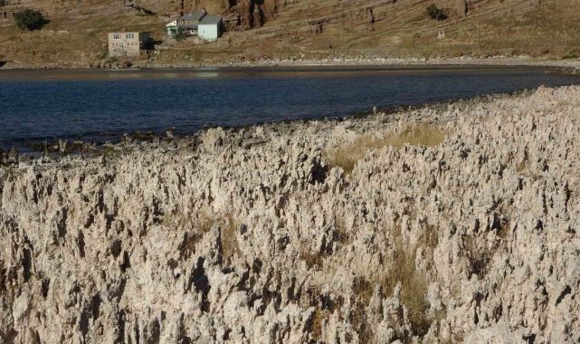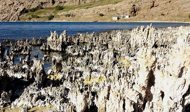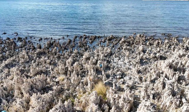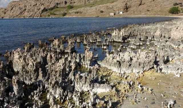 Türkiye'nin tek sodalı gölü olma özelliğini taşıyan Van Gölü'nde, son yıllarda sularının çekilmesiyle sahiller mikrobiyalit tarlasına döndü.