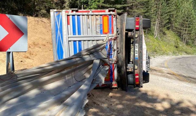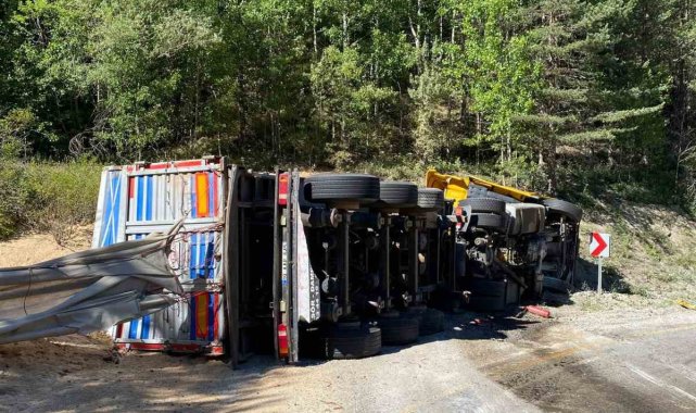 Virajı alamayan talaş yüklü tır devrildi: 2 yaralı