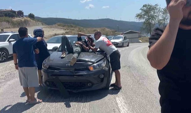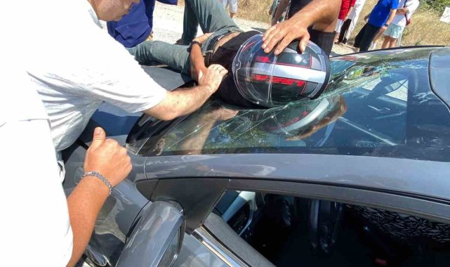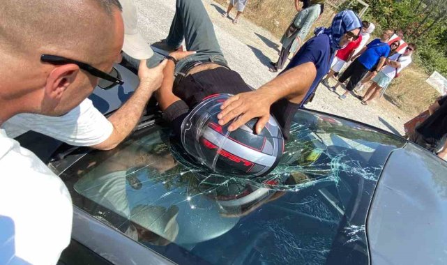 Yalova'da otomobilin çarptığı motosikletin sürücüsü arabanın ön camına düşerek yaralandı.