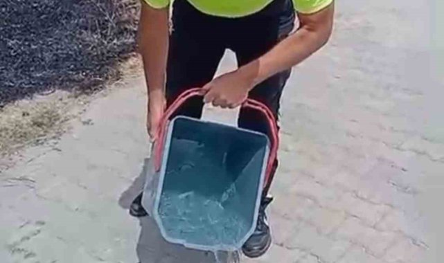 Tokat'ın Erbaa ilçesinde trafik polisleri, yanan otların arasından kurtardıkları kaplumbağayı su ile serinletti. O anlar cep telefonu kamerasıyla kaydedildi.