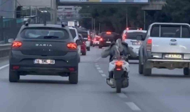 Bursa'da bir motosiklet sürücüsü, trafikte tehlikeli hareketler yaparak hem kendi canını hem de diğer sürücüleri tehlikeye attı. Motosikleti yatarak kullanan trafik magandası kameraya yansıdı.