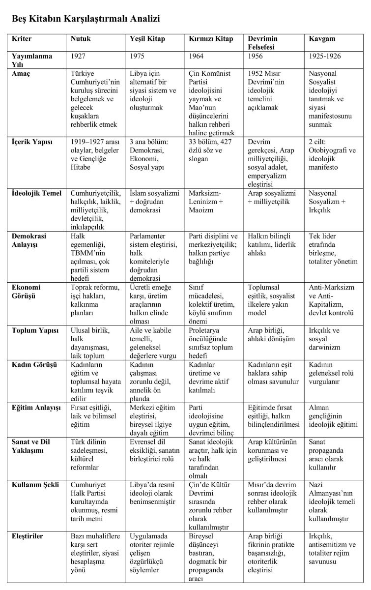 Nutuk (Mustafa Kemal Atatürk), Yeşil Kitap (Muammer Kaddafi), Kırmızı Kitap (Mao Zedong), Kavgam (Adolf Hitler), Devrimin Felsefesi (Cemal Abdül Nasır) kitaplarının karşılaştırmalı bir analizi. Karşılaştırılan başlıca kriterler: Yayımlanma yılı, Amaç, İçerik yapısı, İdeolojik temel, Demokrasi anlayışı, Ekonomi görüşü, Toplum yapısı, Kadın görüşü, Eğitim anlayışı, Sanat ve dil yaklaşımı, Kullanım şekli, Eleştiriler.