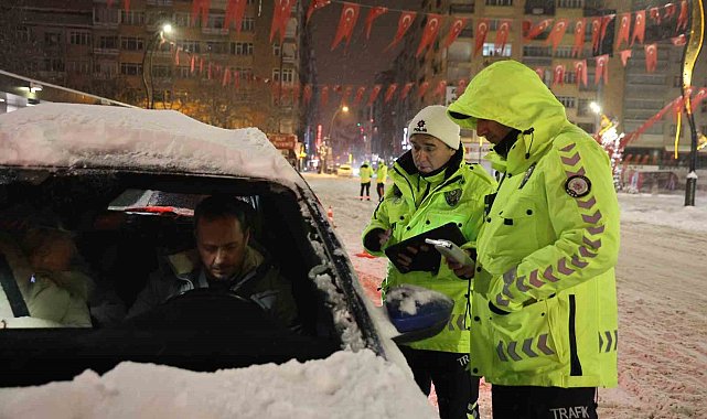 Elazığ'da 2026'nın ilk saatlerinde trafik ekipleri tarafından denetim gerçekleştirildi.Elazığ'da 2026 yılına girerken şehrin birçok noktasında İl Emniyet Müdürlüğü Trafik Denetleme Şube Müdürlüğü tarafından uygulama yapıldı. Kış lastiği, evrak, ehliyet, alkol, emniyet kemeri ve egzoz kontrolü yapan ekipler, sürücülerin yeni yılını kutlayarak trafik kuralları hakkında bilgiler verdi.