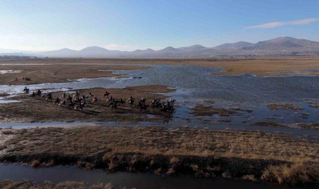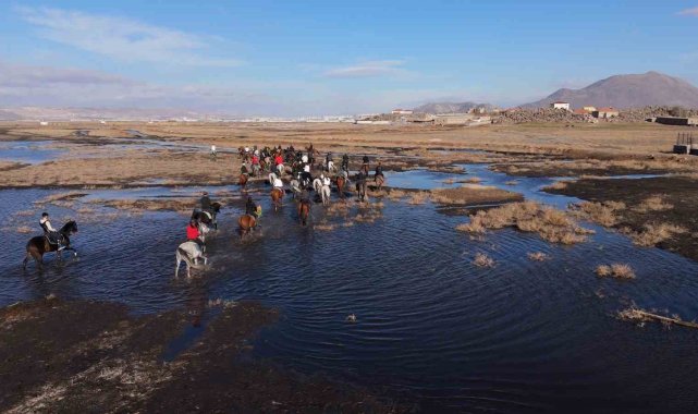 Kayseri'de 50 at binicisi, doğal güzellikleriyle dikkat çeken ve çok sayıda yılkı atının bulunduğu Hürmetçi'de atlı safari yaptı. Atlıların safarisi havadan görüntülendi.