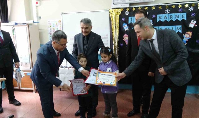 Yozgat'ta 2024-2025 eğitim-öğretim yılının ilk dönemi sona eriyorken 68 bin 669 öğrenci karne alarak yarıyıl tatiline girdi.Gazi Mustafa Kemal İlkokulu-İmam Hatip Ortaokulu'nda karne programına Yozgat Valisi Mehmet Ali Özkan katıldı. Öğrencilerin karne sevincine ortak olan Özkan, çocukları tebrik ederek çeşitli hediyeler verdi. "Bugün 448 eğitim kurumumuzda 68 bin 669 öğrencimize karnelerini teslim ettik. Bu vesileyle yarıyıl tatilinde çocuklarımıza güzel günler diliyorum. Çocuklarımız oyun oynarken kitap okumaya devam edecekler" ifadelerini kullandı.Okulda öğrenim gören 4.sınıf öğrencilerinden Azra Ünal, yarıyıl tatili için hazırladığı konuşmasını okudu. Konuşmasında ilkokula başladığı günden 4.sınıfa kadar yaşadığı süreci anlatan Ünal, sınıf arkadaşlarına ve velilere duygusal anlar yaşattı.Karne dağıtımının ardından okulda görev yapan öğretmenlerle bir araya gelen Vali Özkan, mini toplantı gerçekleştirdi.