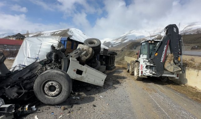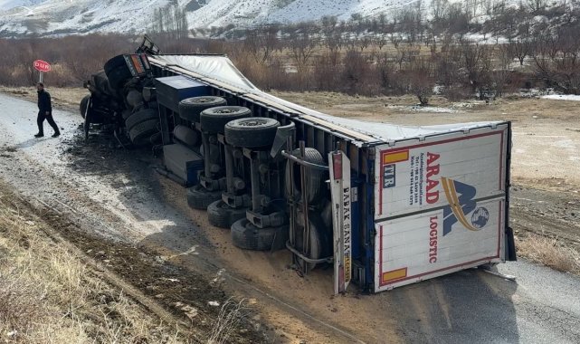 Hakkari'nin Yüksekova ilçesinde kar yağışı ve buzlanma nedeniyle yoldan çıkarak devrilen İran plakalı tırın sürücüsü yaralandı.