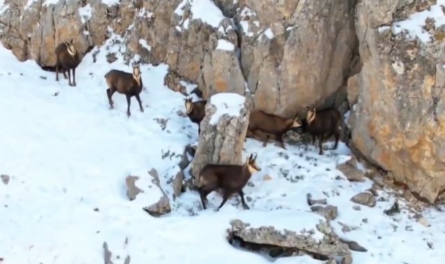 Erzincan'da zirvesi karla kaplı 3 bin rakımlı dağda sürüler halinde gezinip yiyecek arayan, avlanması yasak ve koruma altındaki tür olan dağ keçileri havadan görüntülendi.