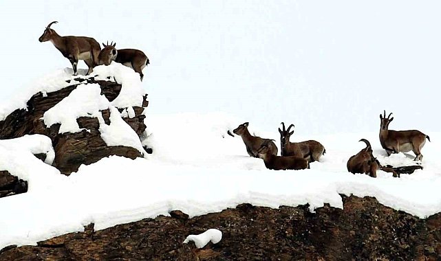 Erzincan'da zirvesi karla kaplı 3 bin rakımlı dağda sürüler halinde gezinip yiyecek arayan, avlanması yasak ve koruma altındaki tür olan dağ keçileri havadan görüntülendi.Dünya Doğa Koruma Birliğinin (IUCN) yayımladığı Nesli Tükenme Tehlikesi Altında Olan Türlerin Kırmızı Listesi'nde bulunan dağ keçileri, Erzincan'ın dağlarına renk katıyor. Yüksek kesimleri hala karla kaplı zirve noktalarda gezinen dağ keçileri, Mert Yılmaz tarafından havadan kayıt altına alındı.