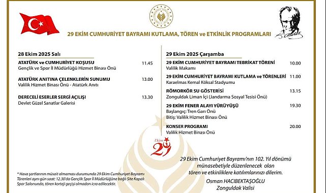 Cumhuriyetin 102. yılı kapsamında kentte yapılacak kutlama, tören ve etkinlik programı Zonguldak Valiliği tarafından duyuruldu.Kutlamalar 28 Ekim Salı günü 11.45'te Gençlik ve Spor İl Müdürlüğü hizmet binası önünde düzenlenecek "Atatürk ve Cumhuriyet Koşusu" ile başlayacak. Aynı gün 13.00'te Valilik hizmet binası önündeki Atatürk Anıtı'na çelenk sunulacak; 13.30'da Devlet Güzel Sanatlar Galerisi'nde dereceli eserler sergisi açılacak.Resmi program 29 Ekim Çarşamba sabahı 10.00'da Valilik makamındaki tebrikatla sürecek. Saat 11.00'de Karaelmas Kemal Köksal Stadyumu'nda kutlama ve resmi törenler gerçekleştirilecek. Günün devamında 13.15'te Zonguldak Limanı içinde, Jandarma Sosyal Tesisi önünde römorkör su gösterisi yapılacak. Akşam 19.30'da Fener Alayı yürüyüşü Tren Garı önünden başlayıp Valilik hizmet binası önünde tamamlanacak; 20.00'de yine aynı alanda konser verilecek.Valilik, olumsuz hava koşulları halinde 29 Ekim törenlerinin aynı gün 12.30'da Gençlik ve Spor İl Müdürlüğüne bağlı Site Kapalı Spor Salonunda, kortej geçişi olmadan icra edileceğini bildirdi.