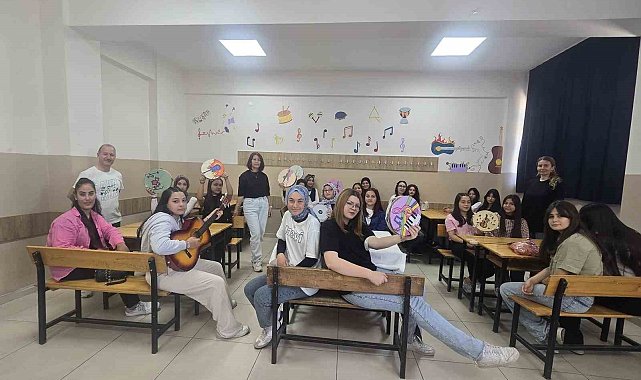Afyonkarahisar Zübeyde Hanım Kız Mesleki ve Teknik Anadolu Lisesi'nde öğrenciler, okul idaresinin desteğiyle 'Müzik Sınıfı' oluşturdu. Öğrenciler tarafından boyanan sınıf duvarları, müzik kulübü faaliyetlerine ve teneffüs saatlerine renk katacak.Okul yönetiminin desteği ve müzik kulübü öğretmenlerinin rehberliğinde başlatılan çalışma kapsamında öğrenciler, boş zamanlarını verimli değerlendirebilecekleri bir müzik atölyesine kavuştu. Hem bireysel hem de grup halinde kullanılabilecek olan müzik sınıfı, öğrencilerin iş birliği ve takım çalışması becerilerini geliştirmeyi hedefliyor.Sınıfın duvar tasarımları, tamamen müzik kulübü öğrencileri tarafından hazırlandı. Çeşitli müzik notaları, ritim figürleri ve enstrüman görselleri öğrencilerin el emeğiyle sınıf duvarlarına resmedildi. Ayrıca müzik temalı boyanan tefler de öğrenciler tarafından hazırlanarak sınıfta yerini aldı.Öğrencilerin müzikle ilgili etkinlikler gerçekleştirilmesine imkân sağlanacakMüzik odasına darbuka, gitar, tef gibi enstrümanlar da okul öğretmenleri tarafından temin edildi. Sınıf, çeşitli ritim araçları ve enstrümanlarla donatılarak öğrencilerin müzikle ilgili etkinlikler gerçekleştirmesine imkân tanıyacak şekilde hazırlandı.Müzik Sınıfı, yalnızca müzik kulübü üyelerinin değil, müzikle ilgilenen tüm öğrencilerin teneffüs aralarında veya boş zamanlarında kullanımına açık olacak. Atölye sayesinde öğrenciler, sosyal becerilerini artırma, birlikte hareket etme ve ortak üretim yapma alışkanlıkları kazanacak.Okul idaresi, benzer sosyal ve sanatsal faaliyetlerin önümüzdeki dönemlerde de sürdürüleceğini bildirdi.